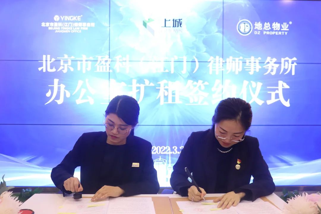 2022年3月28日下午,北京市盈科(江门)律师事务所办公室扩租签约仪式在中信银行大厦24层盈科江门律所纽约厅举行。江门市龙骏置业有限公司总经理苏启翔、江门市新会区地总物业管理有限公司蓬江分公司主任黄雪琴、经理黄业琳、李嘉欣、盈科江门律所执行主任于润涵、党支部书记杨敏、管委会主任周渊、监事会主任徐林英、监事会副主任谭坚良出席本次签约仪式。